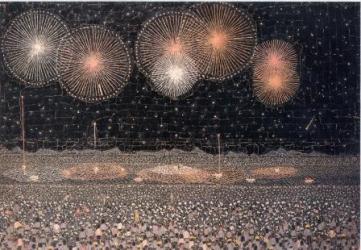 写真撮影禁止で パンフレットのコピー 記憶力の良さで放浪中は描かず、 帰ってから 思い出し正確に描いていたそうな 緻密な貼り絵の 代表作「長岡の花火」 清最後の言葉「今年 の花火見物はどこに 行こうかな」 昭和46年 享年49歳